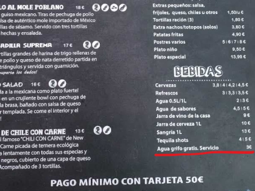 La asociación de Consumidores en Acción, Facua, ha denunciado al restaurante El Mexicano de Noja, en Cantabria, ante la Dirección General de Comercio y Consumo de dicha comunidad por cobrar tres euros por servir agua del grifo pese a que la legislación obliga a hacerlo de forma totalmente gratuita.