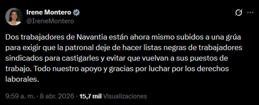 «Dos trabajadores de Navantia están ahora mismo subidos a una grúa para exigir que la patronal deje de hacer listas negras de trabajadores sindicados para castigarles y evitar que vuelvan a sus puestos de trabajo», ha escrito la eurodiputada de Podemos Irene Montero en su perfil de la red social X.