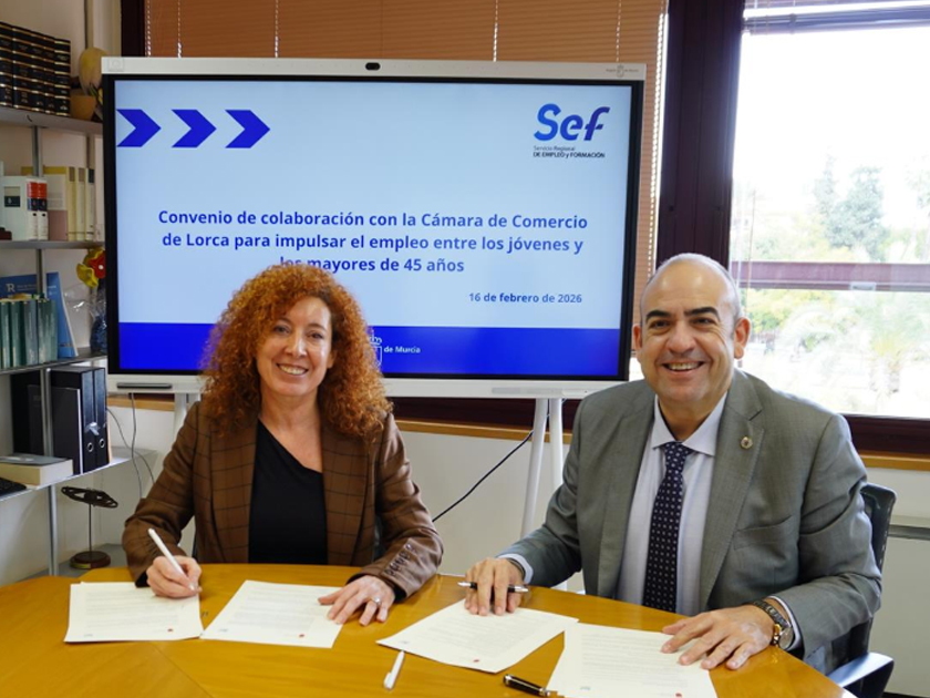 La Consejería de Empresa, Empleo y Economía Social, a través del Servicio Regional de Empleo y Formación (SEF), ha firmado un convenio de colaboración con la Cámara de Comercio de Lorca con el objetivo de mejorar las oportunidades de empleo y el emprendimiento entre jóvenes y personas mayores de 45 años. El acuerdo, formalizado este lunes por la directora general del SEF, Pilar Valero, y el presidente de la Cámara de Comercio de Lorca, Juan Francisco Gómez, establece un marco de cooperación para coordinar esfuerzos y recursos dirigidos a mejorar la inserción laboral de estos dos colectivos.