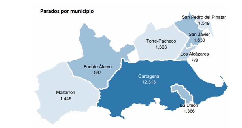 Del total, 12.313 se encuentran en el municipio de Cartagena; 1.630 en San Javier; 1.519 en San Pedro del Pinatar; 1.446 en Mazarrón; 1.366 en La Unión; 1.363 en Torre Pacheco; 779 en Los Alcázares y 587 en Fuente Álamo.
