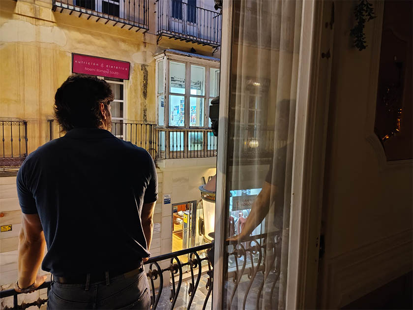 Juan Pedro Rubira observa la calle Mayor desde los Balcones del salón superior del local. Foto: A. S.