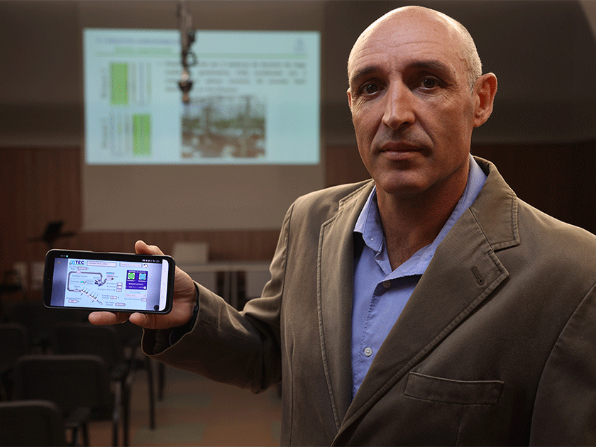 Francisco Sánchez Millán mostrando el software de control del sistema de riego inteligente que ha desarrollado. Foto: UPCT