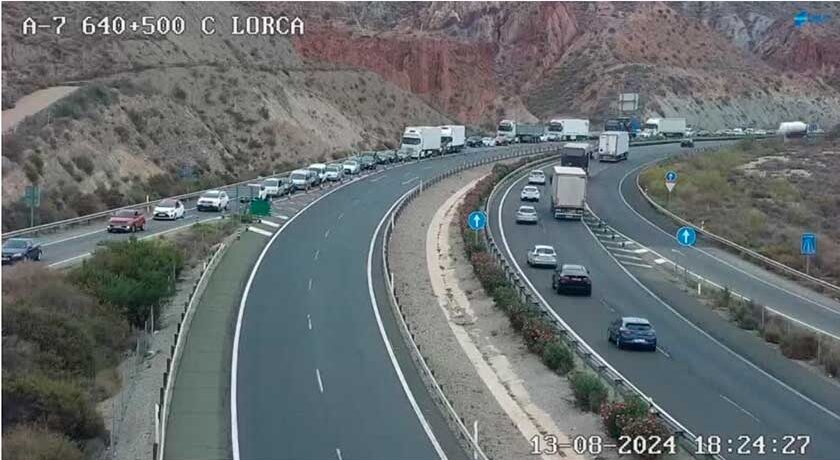 La Guardia Civil mantiene el tráfico cortado en la A-7 a su paso por Lorca desde las 17.25 horas, debido a que un camión ha perdido su cargamento de naranjas, según han confirmado fuentes del cuerpo.