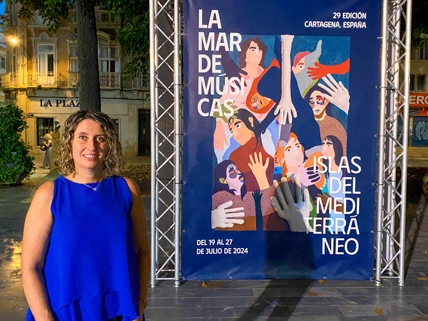 Estíbaliz Bragulat, autora del TFG, junto a un cartel del festival La Mar de Músicas. Foto: UPCT