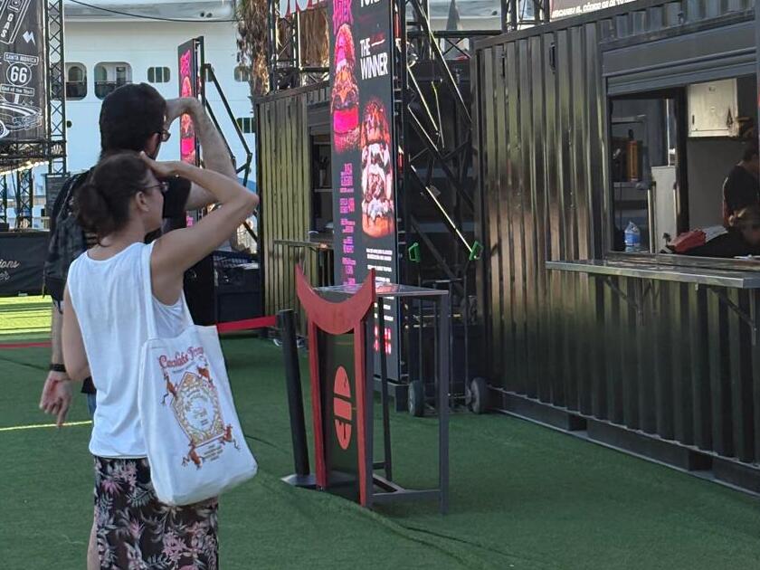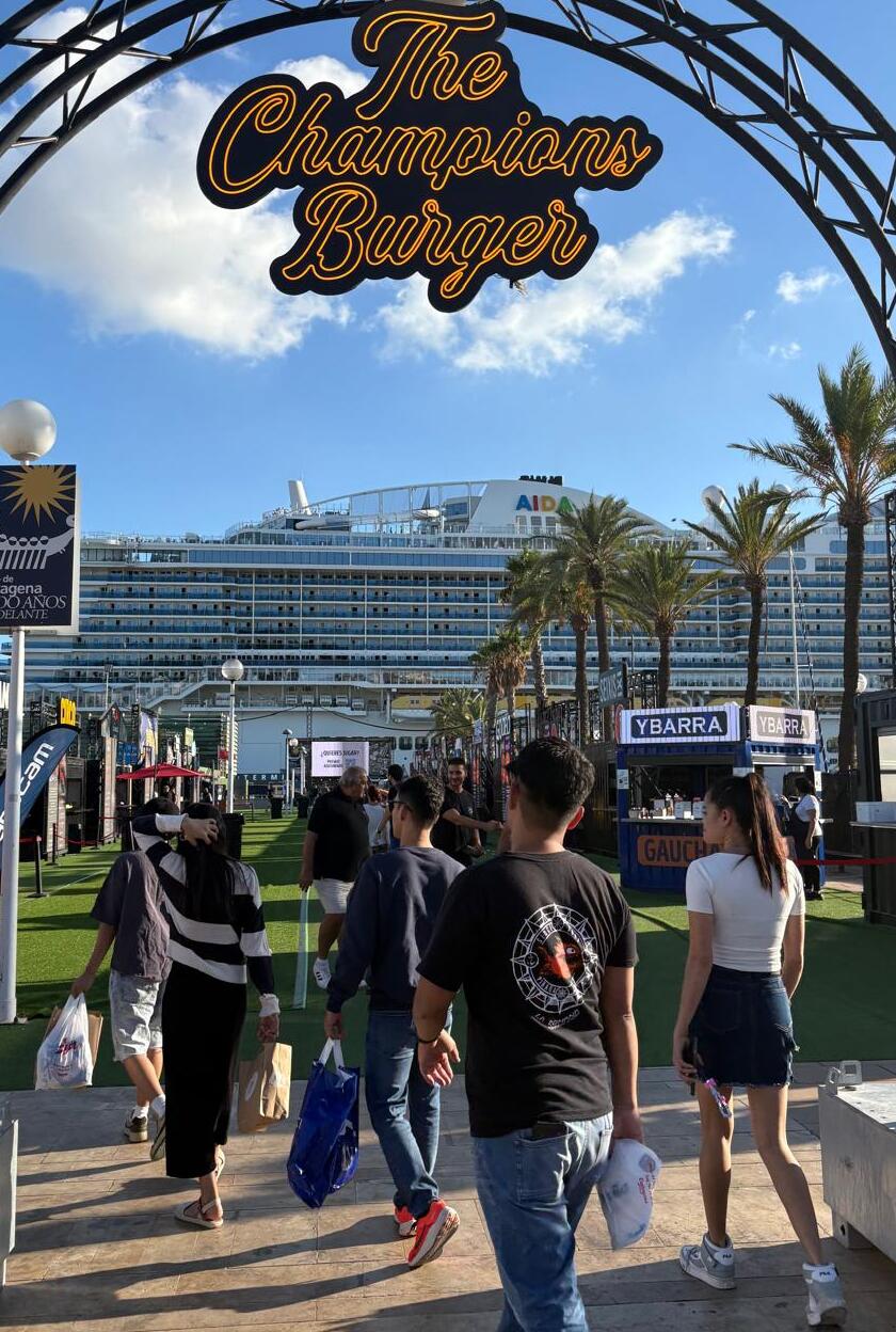 «Es un festival de sabor. Una fiesta gastronómica única con una oferta excelente, música, sorteos y buen ambiente», celebró Ana Sánchez, staff de una de las empresas participantes en The Champions Burger mientras atendía a tres cruceristas del gigante AIDAcosma, atracado en el puerto de Cartagena junto con el World Navigator.