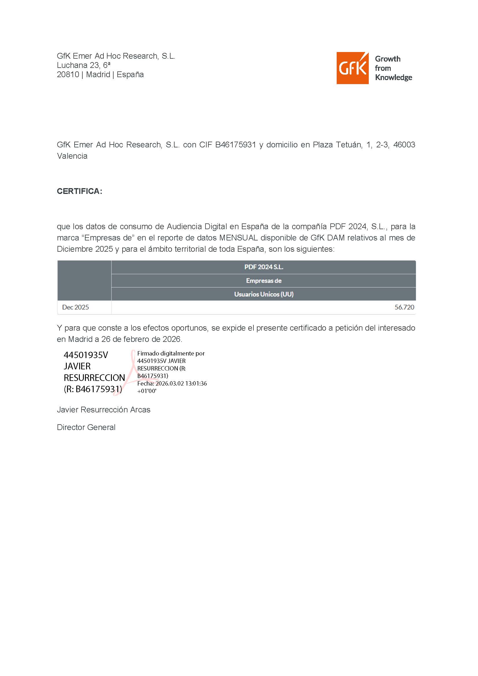 Y tal y como este periódico publicó, Empresas de Murcia, Empresas de Lorca y Empresas de Cartagena, obtuvieron en diciembre al menos un 50% más de usuarios únicos deduplicados que sus competidores. Como indica el certificado adjunto, 56.720 para ser exactos: