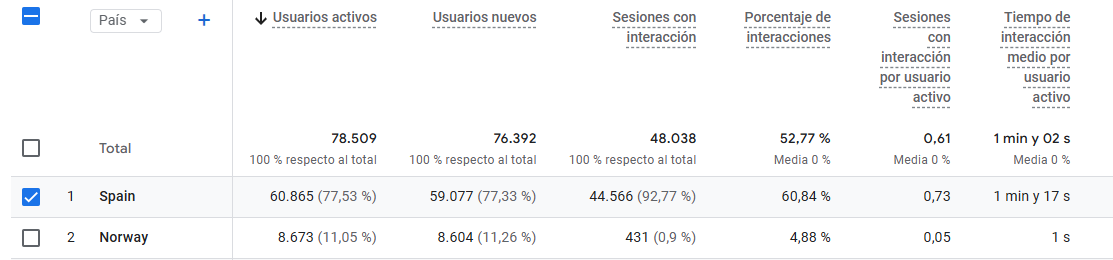 Y sí, nosotros también recibimos visitas de robots (es inevitable), pero no los incluimos en nuestros informes ni los incluimos en nuestras mediciones de audiencias ni mostramos pantallazos de Google Analytics que sumen ese tráfico extranjero, falso o artificial. Como pueden ver abajo, en enero tuvimos casi 9.000 visitantes de Noruega (con una media de duración de 1 segundo, ergo obviamente tráfico de robots), y de otros países, pero en nuestros informes (tanto propios como auditados) siempre figurarán solo los usuarios españoles…. y humanos.