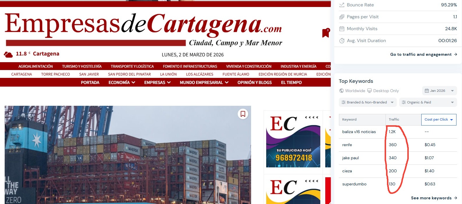 Un ojo entrenado puede saber si el tráfico de una web es real o artificial mirando determinados parámetros, o si los datos “estimados” son correctos. En ese mismo pantallazo dice que las primeras cinco fuentes de tráfico procedente de Google para El Nuevo Digital Murcia apenas le dan 800 visitas. De ahí a los cientos de miles de visitas de las que presumen hay un trecho muy largo, tráfico que, como explicaré luego, no sé de dónde saldrá. Pero lo más llamativo es que esa misma parte de abajo del pantallazo, en este caso de EmpresasdeCartagena nos da 2.000 visitas (solo la edición Cartagena, sin contar Murcia y Lorca), 2,5 veces EmpresasdeCartagena más que a El Nuevo Digital Murcia. Dato que, cuando menos, chirría.