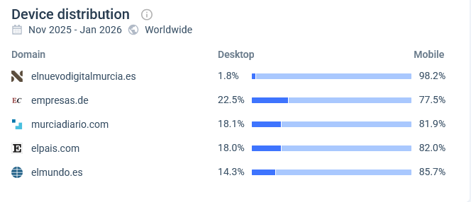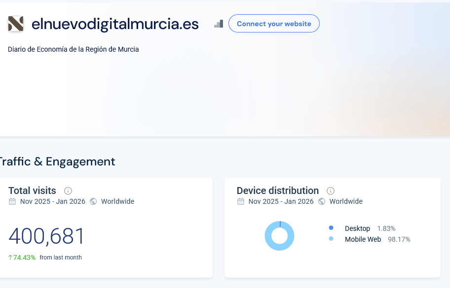 El primero, según esa misma herramienta, más del 98% del tráfico de El Nuevo Digital Murcia durante los últimos tres meses (400.000 supuestas visitas) proviene de dispositivos móviles.