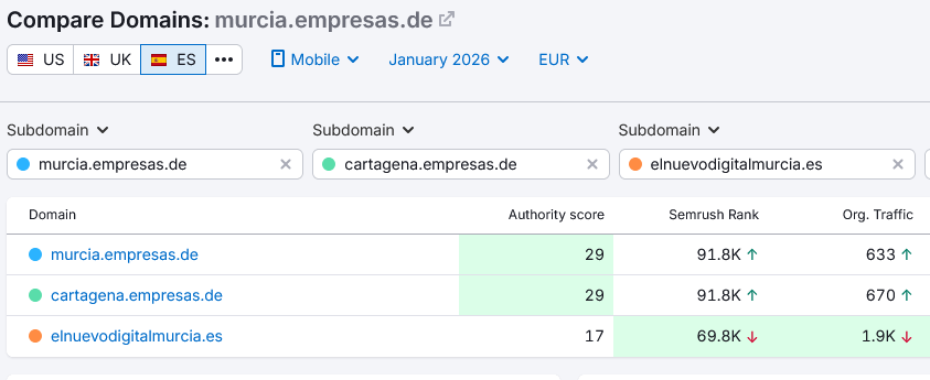 Y por algún motivo, la autoridad de los subdominios de EmpresasdeMurcia y EmpresasdeCartagena, es en ambos casos 29, según Semrush. La autoridad de El Nuevo Digital Murcia es 17, siempre para España y en tanto en PCs como en dispositivos móviles. También, si se fijan, dice que el tráfico combinado (escritorio más móvil) procedente de buscadores es más del doble en el caso de EmpresasdeCartagena y EmpreasdeMurcia (cada una de ellas por separado), que el de ElNuevo Digital Murcia. Totalmente lo contrario que la versión gratuita (o la parte que se ve en los pantallazos recortados) distribuidos por el periódico del señor Betancor, y bastante coincidente con la parte de los datos ofrecidos por SimilarWeb que ellos ocultan. Pueden preguntar también en grandes agencias cuál de las dos herramientas prefieren actualmente. Las grandes de verdad les dirán que ninguna, que de quien se fían es de GfK o de OJD, de las que luego hablaremos.
