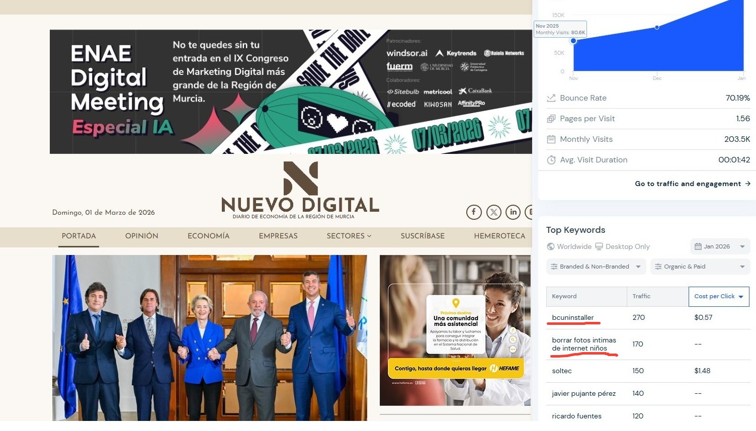 Antes de entrar en números, un inciso. En primer lugar, aunque para mí no sea lo más importante, pero sí resulta llamativo, les muestro la parte del pantallazo sobre su propio medio que los responsables de El Nuevo Digital Murcia omitieron en su informe y sus «pantallazos», la parte de abajo de la captura de imagen, en la que indica cuáles son las búsquedas más habituales de los usuarios que llegan a dicha página. Por si no lo ven bien, las dos primeras fuentes de tráfico procedente de buscadores de El Nuevo Digital Murcia, según ese mismo pantallazo, son “bcuinstaller” y “borrar fotos íntimas de internet niños”.